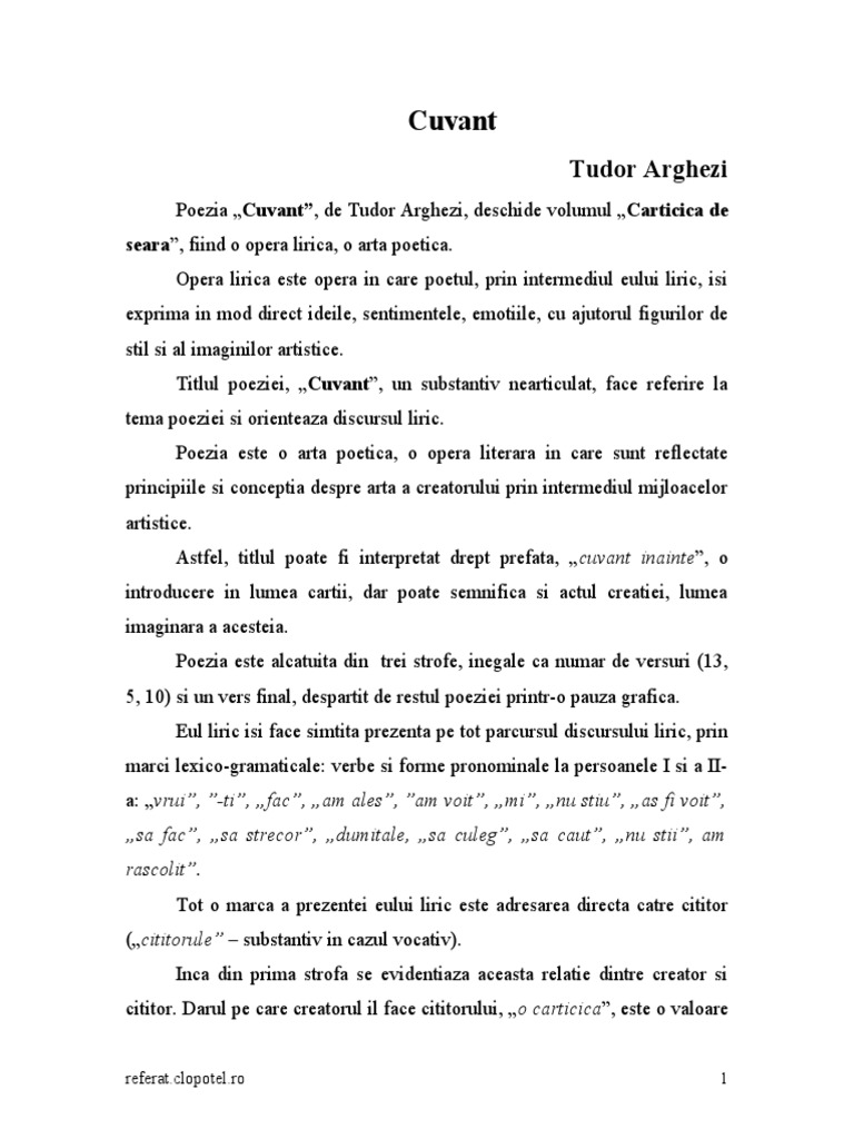 Cuvant De Tudor Arghezi Comentariu Ro