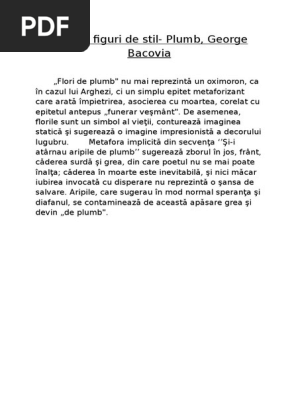 Figurile de stil din poezia plumb de george bacovia si explicati lor 1 vezi răspunsul giigii giigii cuv plumb este folosit si ca simbol si ca epitet. Figuri de stil in poezia plumb de george bacovia. 1 încadrare într un curent specie george bacovia este unul dintre marii poeţi. 1 vezi răspunsul tami tami sicriele de plumb metafora flori de plumb oximoron funerar vestmint epitet in inversiune coroanele de plumb.
