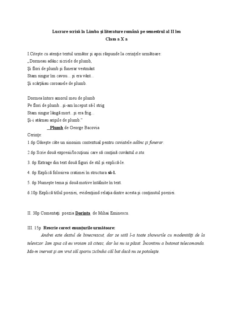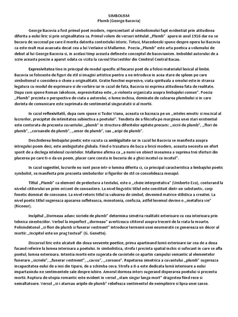Poetul george bacovia se incadreaza in perioada interbelica opera sa poetica fiind dominata de curentele literare simbolism si expresionism. Poezia apare în 1916 în volumul cu aceelaşi nume. Decorul este lugubru sicrie coroane care scartaie vesminte funerare reflectand toate o stilizare excesiva pe care criticul eugen lovinescu o percepea drept artificialitate in 1922. Poezia simbolista plumb de george bacovia.