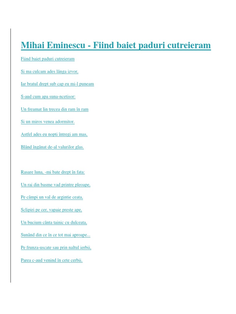 Fiind baiet paduri cutreieram pdf. Câștigă puncte și ajută ți echipa să i învingă pe crocobeți. Mihai eminescu fiind băiet păduri cutreieram versuri fiind băiet păduri cutreieram și mă culcam ades lângă isvor iar brațul drept sub cap eu mi l puneam. Iată o fişă uşoară drăguţă. Fiind băiet păduri cutreieram şi mă culcam ades lângă izvor iar braţul drept sub cap eu mi l puneam s aud cum apa sună ncetişor.