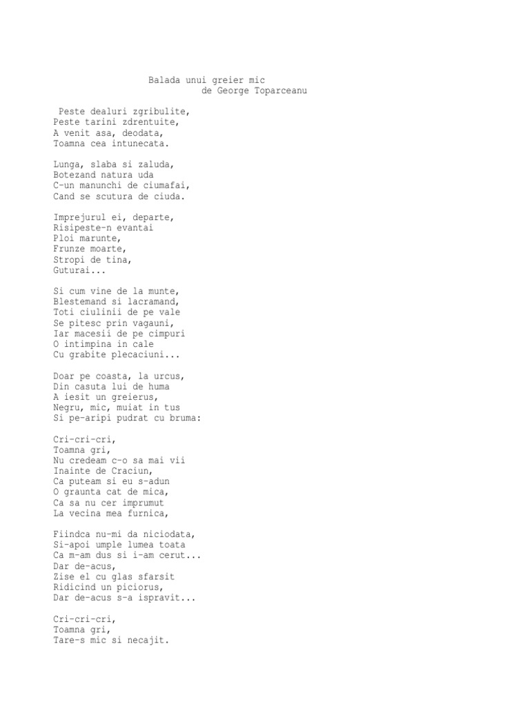 Tema La Limba Romana Balada Unui Greier Mic De George Toparceanu