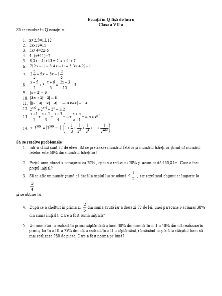 Ecuaţii In Q Fisă De Lucru Clasa A Vii A X X X X X