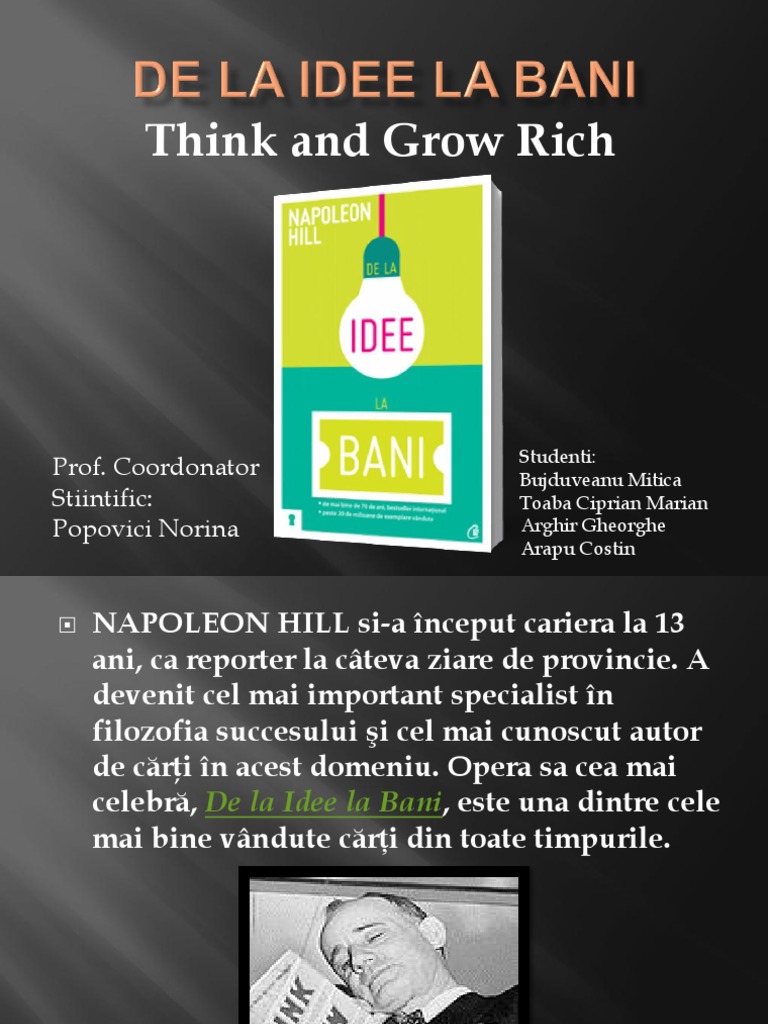 Report napoleon hill de la idee la bani pdf please fill this form we will try to respond as soon as possible. Principalul element comun al acestora este un scop dorință vis bine definit şi dorința intensă de a reuşi. Expunând în esenţă 13 paşi spre îmbogăţire autorul mizează în primul rând pe cultivarea unei conştiinţe a banilor a unei întregi filosofii despre succes şi prosperitate. Cartea de la idee la bani este o sinteză a modului de viață și mentalităților a peste 40 de milionari care au relatat modul lor de evoluție în business.