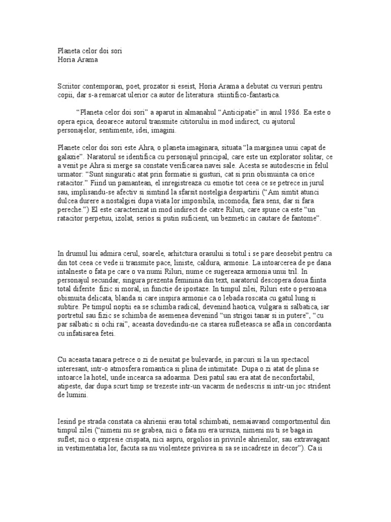Planeta celor doi sori este o povestire scrisă de horia aramă și publicată în almanahul anticipația în anul 1986. învăţământ gimnazial limba şi literatura român ă. Scriitor contemporan atât poet cât și prozator horia aramă și a început activitatea scriitoricească publicând versuri pentru copii dar apoi s a remarcat prin operele sale aparținând literaturii științifico fantastice. După o noapte obositoare rătăcitorul pleacă de la hotel amintindu şi că fusese sfătuit să evite vizitarea planetei ahra.