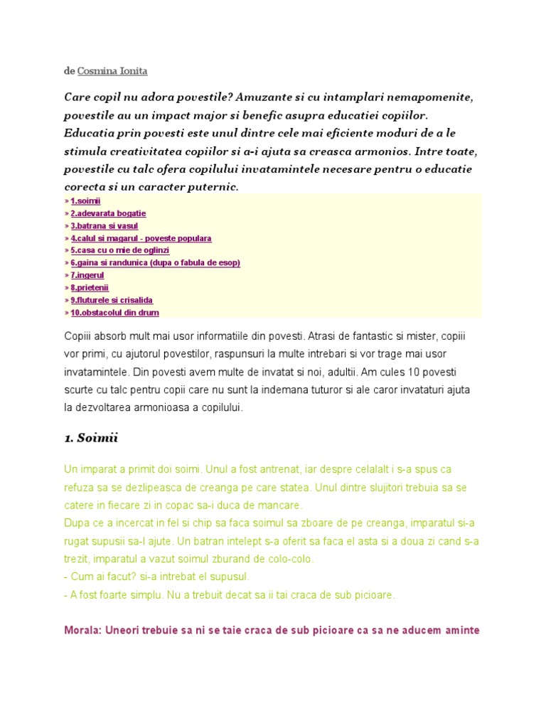 Povesti Scurte Cu Morala Pentru Copii