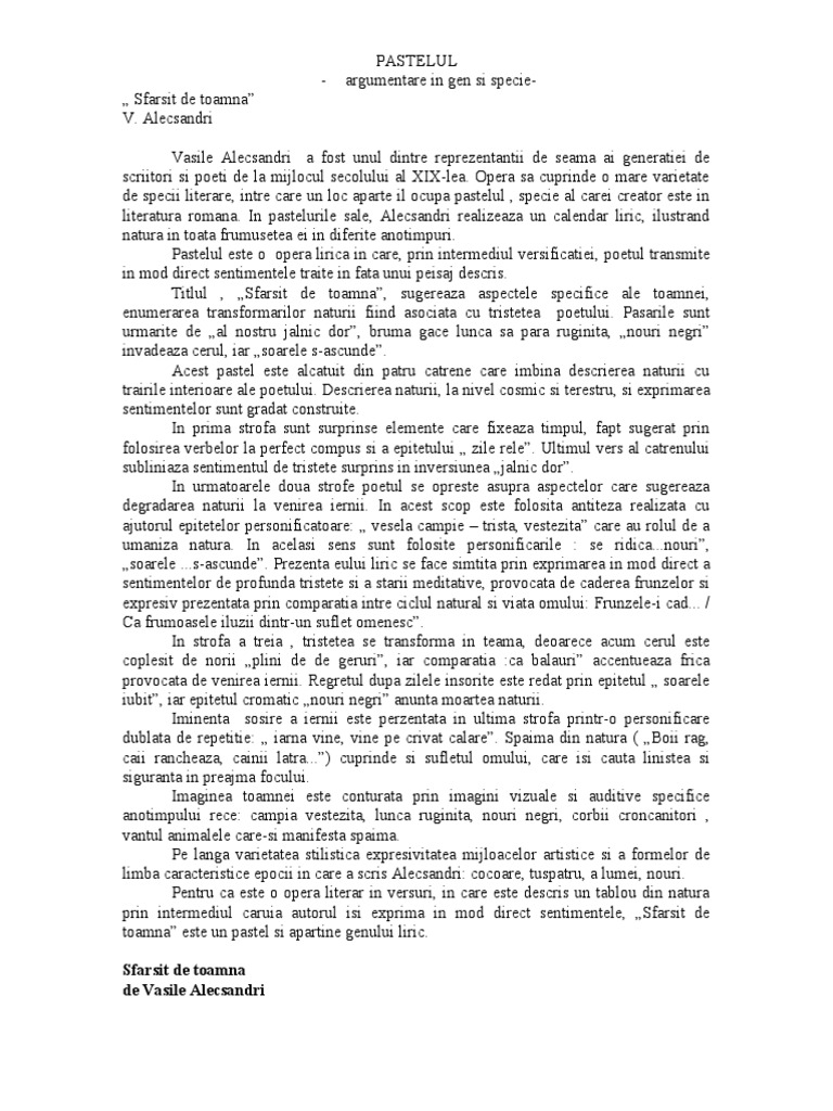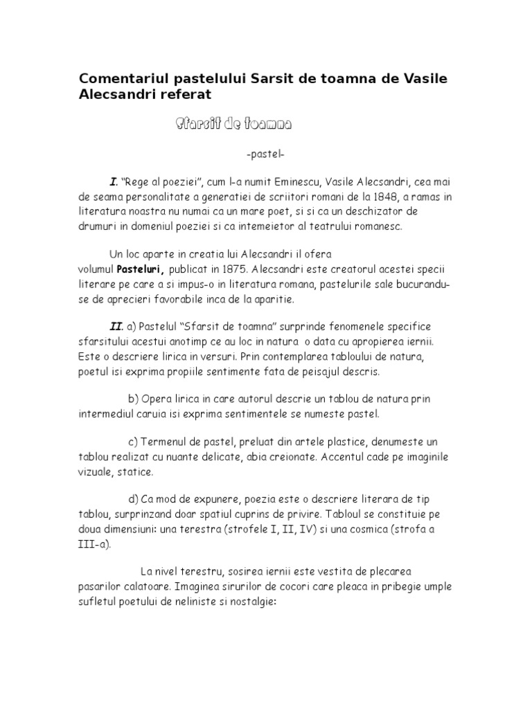 Comentariul Pastelului Sarsit De Toamna De Vasile Alecsandri Referat Doc