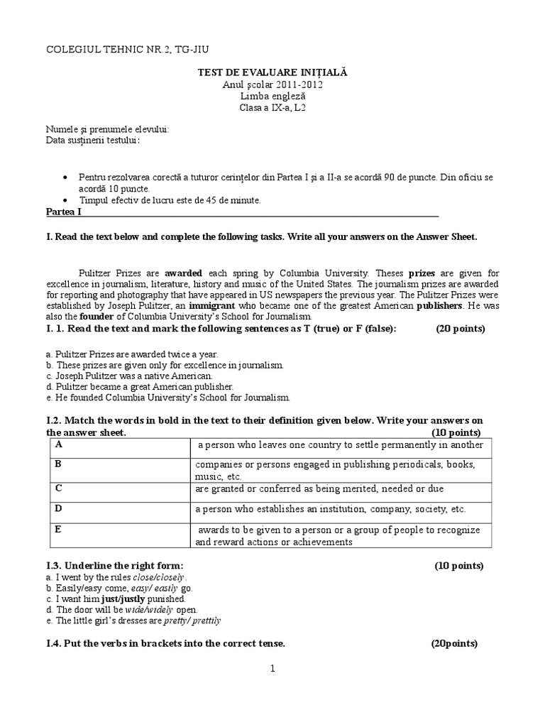 Test De Evaluare Iniţială Anul Scolar 2013 2014 Limba Engleză Clasa A Vii A L1 Alina Jitariu Academia Edu
